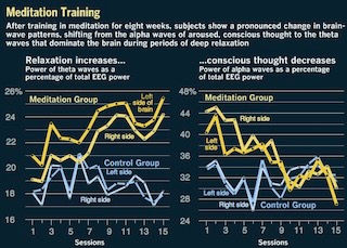 Dopo un training di meditazione di 8 settimane, Il cervello dei soggetti del gruppo di Meditazione rispetto al gruppo di controllo ha evidenziato un pronunciato cambiamento nel funzionamento delle onde cerebrali registrato attraverso l’EEG (Elettro Encefalo Gramma), passando da onde alfa, tipiche della fase del pensiero cosciente, a onde teta, presenti nel cervello in fase di rilassamento profondo. Questo fenomeno ci mostra che si è verificato un rilassamento profondo ed è diminuita l’attività della mente cosciente nel gruppo di Meditanti, rispetto al gruppo di controllo.